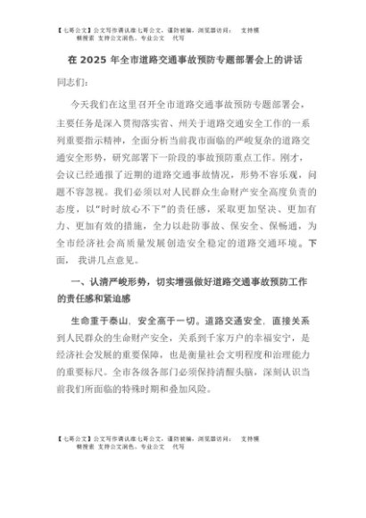 【七哥公文】2025年:在2025年全市道路交通事故预防专题部署会上的讲话+更多免费公文+VX:QiGeGongWen2024