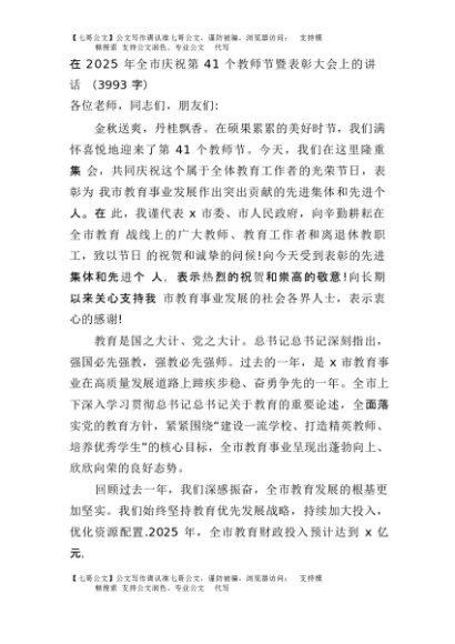 【七哥公文】2025年:在2025年全市庆祝第41个教师节暨表彰大会上的讲话(3993字)+更多免费公文+VX:QiGeGongWen2024