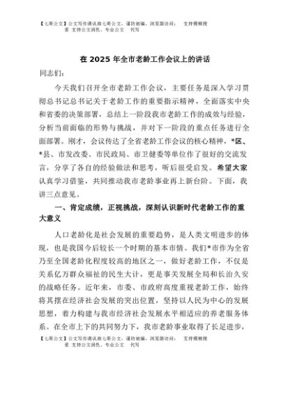 / 【七哥公文】2025年:在2025年全市老龄工作会议上的讲话+更多免费公文+VX:QiGeGongWen2024