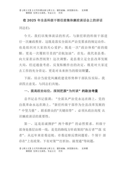 【七哥公文】2025年:在2025年全县科级干部任前集体廉政谈话会上的讲话+更多免费公文+VX:QiGeGongWen2024