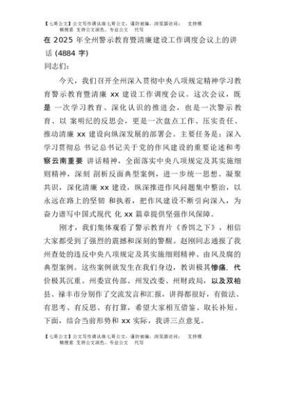 【七哥公文】2025年:在2025年全州警示教育暨清廉建设工作调度会议上的讲话(4884字)+更多免费公文+VX:QiGeGongWen2024