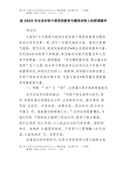 【七哥公文】2025年:在2025年全县年轻干部党性教育专题培训班上的授课辅导+更多免费公文+VX:QiGeGongWen2024
