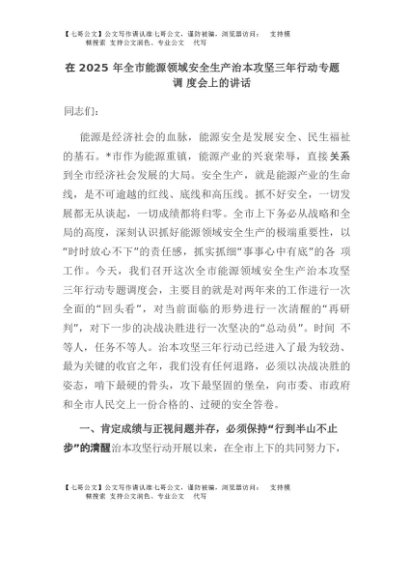 【七哥公文】2025年:在2025年全市能源领域安全生产治本攻坚三年行动专题调度会上的讲话+更多免费公文+VX:QiGeGongWen2024