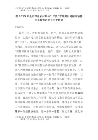 【七哥公文】2025年:在2025年全市深化农村集体“三资”管理突出问题专项整治工作推进会上的主持词+更多免费公文+VX:QiGeGongWen2024