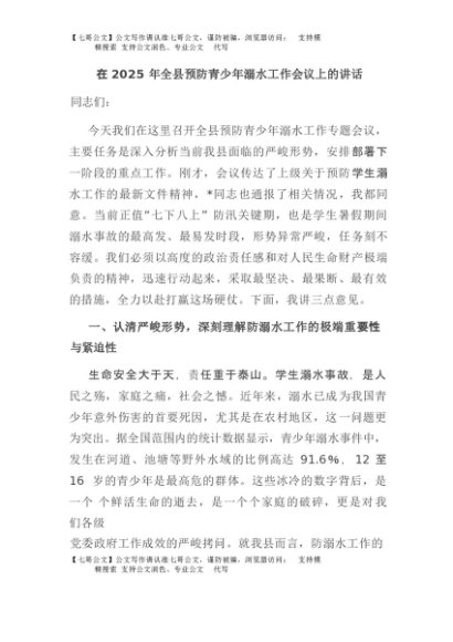 / 【七哥公文】2025年:在2025年全县预防青少年溺水工作会议上的讲话+更多免费公文+VX:QiGeGongWen2024