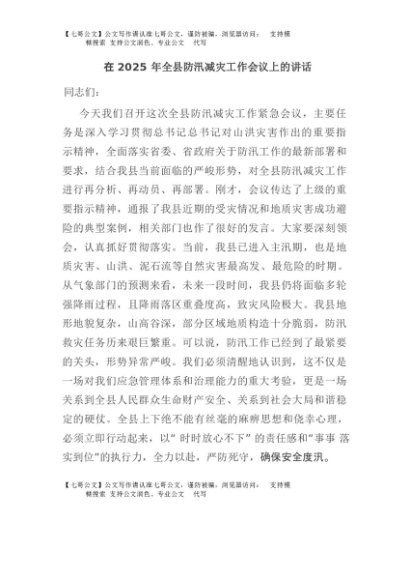 / 【七哥公文】2025年:在2025年全县防汛减灾工作会议上的讲话+更多免费公文+VX:QiGeGongWen2024