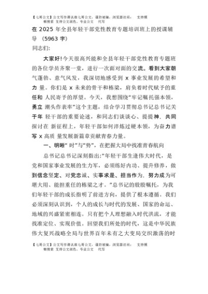 【七哥公文】2025年:在2025年全县年轻干部党性教育专题培训班上的授课辅导(5963字)+更多免费公文+VX:QiGeGongWen2024