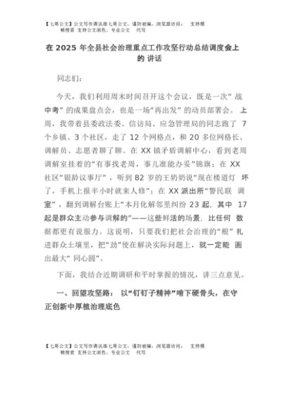 【七哥公文】2025年:在2025年全县社会治理重点工作攻坚行动总结调度会上的讲话+更多免费公文+VX:QiGeGongWen2024