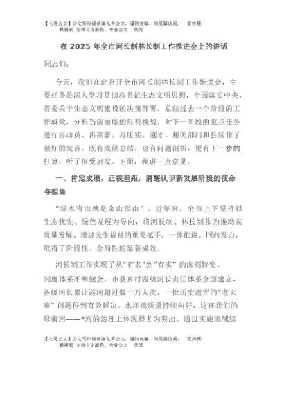 / 【七哥公文】2025年:在2025年全市河长制林长制工作推进会上的讲话+更多免费公文+VX:QiGeGongWen2024