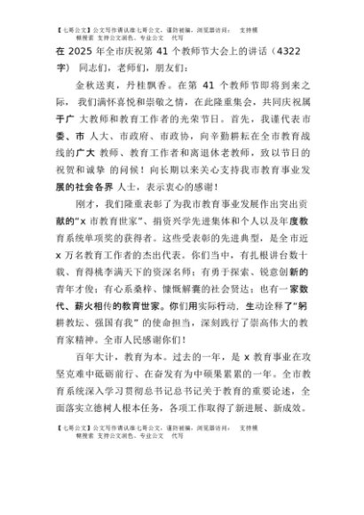 【七哥公文】2025年:在2025年全市庆祝第41个教师节大会上的讲话(4322字)+更多免费公文+VX:QiGeGongWen2024