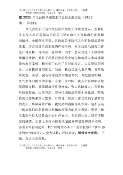 【七哥公文】2025年:在2025年全县防汛减灾工作会议上的讲话(3403字)+更多免费公文+VX:QiGeGongWen2024