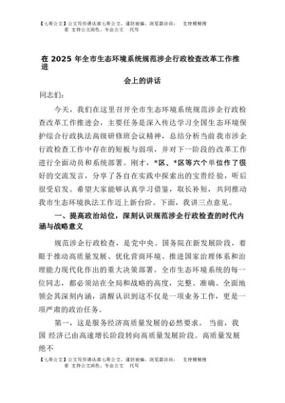 【七哥公文】2025年:在2025年全市生态环境系统规范涉企行政检查改革工作推进会上的讲话+更多免费公文+VX:QiGeGongWen2024