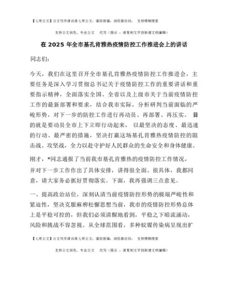 【七哥公文】2025年:在2025年全市基孔肯雅热疫情防控工作推进会上的讲话+更多免费公文+VX:QiGeGongWen2024