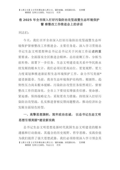 【七哥公文】2025年:在2025年全市深入打好污染防治攻坚战暨生态环境保护督察整改工作推进会上的讲话+更多免费公文+VX:QiGeGongWen2024