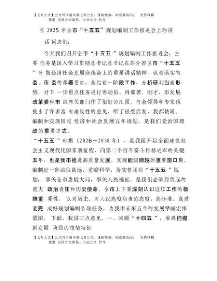【七哥公文】2025年:在2025年全市“十五五”规划编制工作推进会上的讲话+更多免费公文+VX:QiGeGongWen2024