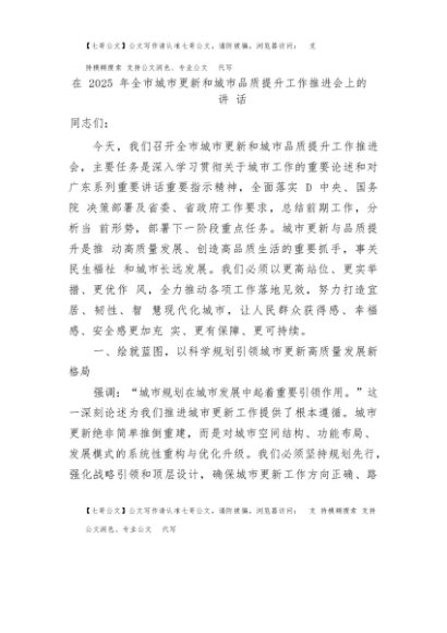 【七哥公文】2025年:在2025年全市城市更新和城市品质提升工作推进会上的讲话+更多免费公文+VX:QiGeGongWen2024