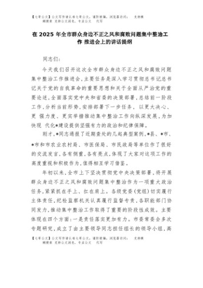 【七哥公文】2025年:在2025年全市群众身边不正之风和腐败问题集中整治工作推进会上的讲话提纲+更多免费公文+VX:QiGeGongWen2024