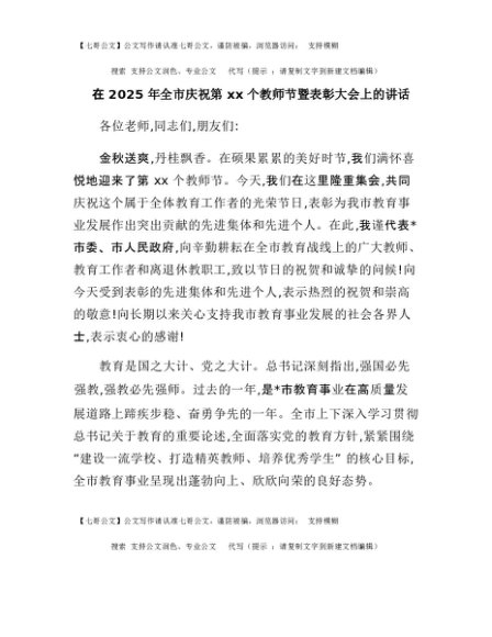 【七哥公文】2025年:在2025年全市庆祝第41个教师节暨表彰大会上的讲话+更多免费公文+VX:QiGeGongWen2024