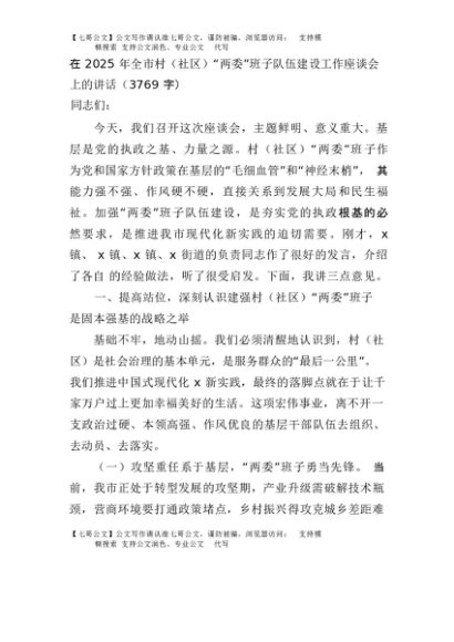 【七哥公文】2025年:在2025年全市村(社区)“两委”班子队伍建设工作座谈会上的讲话(3769字)+更多免费公文+VX:QiGeGongWen2024