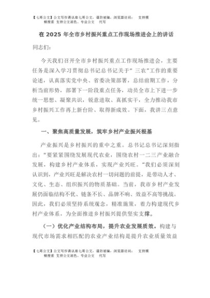 【七哥公文】2025年:在2025年全市乡村振兴重点工作现场推进会上的讲话+更多免费公文+VX:QiGeGongWen2024