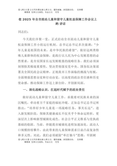 【七哥公文】2025年:在2025年全市流动儿童和留守儿童权益保障工作会议上的讲话+更多免费公文+VX:QiGeGongWen2024