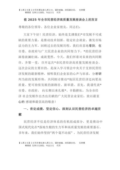 【七哥公文】2025年:在2025年全市民营经济高质量发展座谈会上的发言+更多免费公文+VX:QiGeGongWen2024