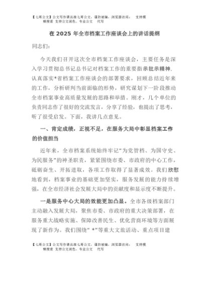 / 【七哥公文】2025年:在2025年全市档案工作座谈会上的讲话提纲+更多免费公文+VX:QiGeGongWen2024