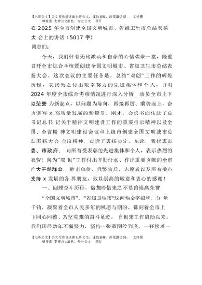 【七哥公文】2025年:在2025年全市创建全国文明城市、省级卫生市总结表扬大会上的讲话(5017字)+更多免费公文+VX:QiGeGongWen2024