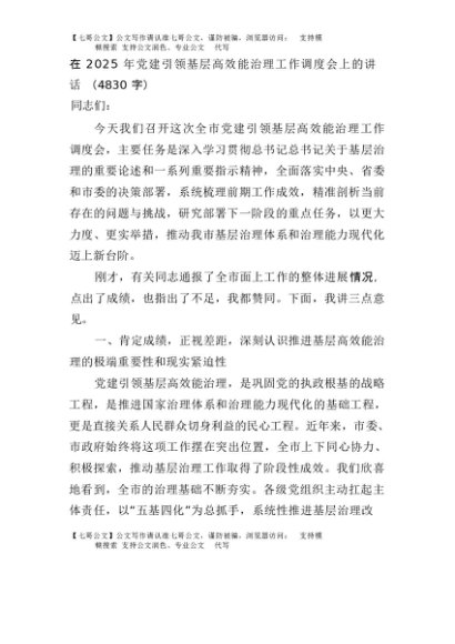 【七哥公文】2025年:在2025年党建引领基层高效能治理工作调度会上的讲话(4830字)+更多免费公文+VX:QiGeGongWen2024