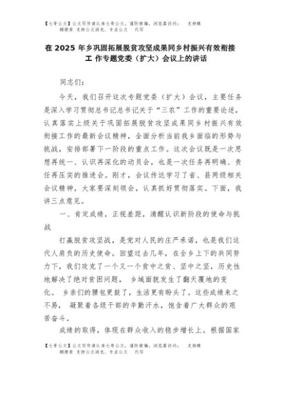 【七哥公文】2025年:在2025年乡巩固拓展脱贫攻坚成果同乡村振兴有效衔接工作专题党委(扩大)会议上的讲话+更多免费公文+VX:QiGeGongWen2024