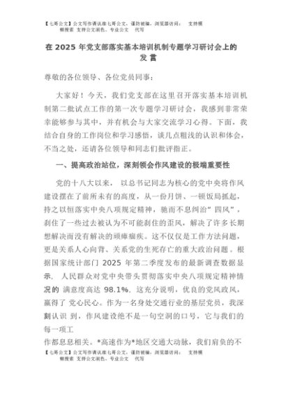 【七哥公文】2025年:在2025年党支部落实基本培训机制专题学习研讨会上的发言+更多免费公文+VX:QiGeGongWen2024