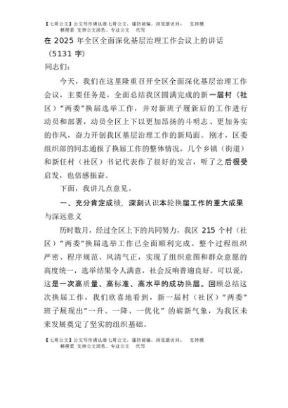 【七哥公文】2025年:在2025年全区全面深化基层治理工作会议上的讲话(5131字)+更多免费公文+VX:QiGeGongWen2024