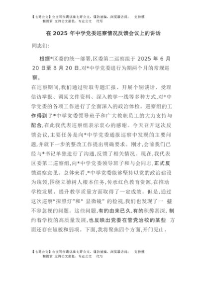 / 【七哥公文】2025年:在2025年中学党委巡察情况反馈会议上的讲话+更多免费公文+VX:QiGeGongWen2024