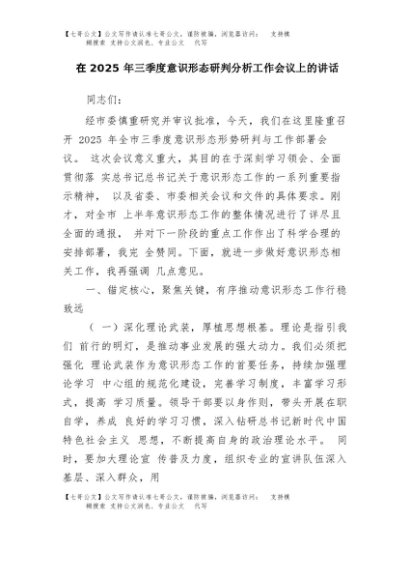 【七哥公文】2025年:在2025年三季度意识形态研判分析工作会议上的讲话+更多免费公文+VX:QiGeGongWen2024
