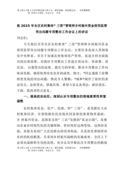 【七哥公文】2025年:在2025年全区农村集体“三资”管理和乡村振兴资金使用监管突出问题专项整治工作会议上的讲话+更多免费公文+VX:QiGeGongWen2024