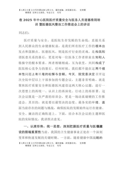【七哥公文】2025年:在2025年中心医院医疗质量安全与医务人员道德准则培训暨医德医风整治工作推进会上的讲话+更多免费公文+VX:QiGeGongWen2024