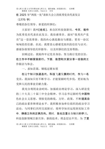 【七哥公文】2025年:在2025年“两优一先”表彰大会上的优秀党员代表发言(1775字)+更多免费公文+VX:QiGeGongWen2024