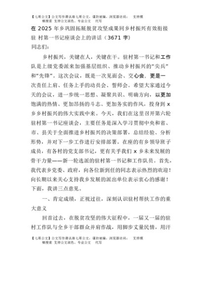 【七哥公文】2025年:在2025年乡巩固拓展脱贫攻坚成果同乡村振兴有效衔接驻村第一书记座谈会上的讲话(3671字)+更多免费公文+VX:QiGeGongWen2024
