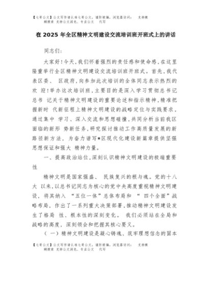 【七哥公文】2025年:在2025年全区精神文明建设交流培训班开班式上的讲话+更多免费公文+VX:QiGeGongWen2024