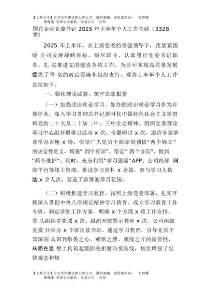 【七哥公文】2025年:国企党委书记2025年上半年个人工作总结(3328字)+更多免费公文+VX:QiGeGongWen2024
