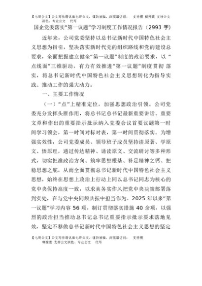【七哥公文】2025年:国企党委落实“第一议题”学习制度工作情况报告(2993字)+更多免费公文+VX:QiGeGongWen2024