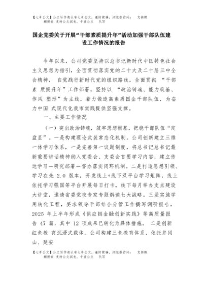 【七哥公文】2025年:国企党委关于开展“干部素质提升年”活动加强干部队伍建设工作情况的报告+更多免费公文+VX:QiGeGongWen2024