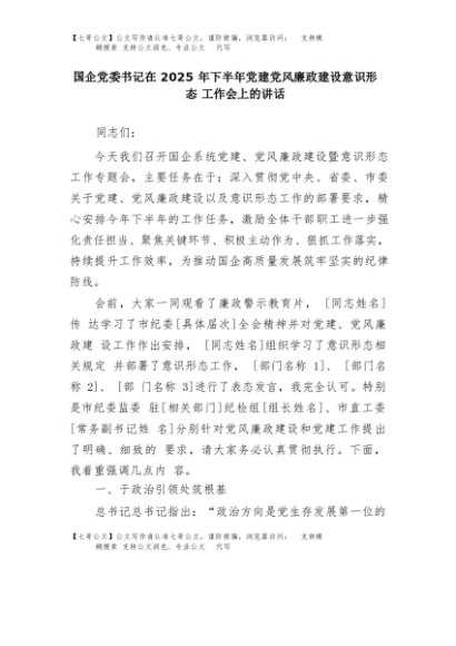 【七哥公文】2025年:国企党委书记在2025年下半年党建党风廉政建设意识形态工作会上的讲话+更多免费公文+VX:QiGeGongWen2024