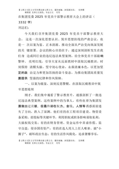 【七哥公文】2025年:国企党委2025年党员干部警示教育大会上的讲话(3332字)+更多免费公文+VX:QiGeGongWen2024
