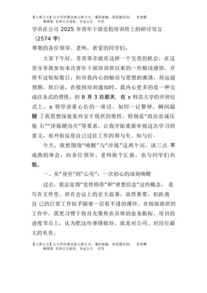 【七哥公文】2025年:国企学员在公司2025年青年干部党校培训班上的研讨发言(2574字)+更多免费公文+VX:QiGeGongWen2024