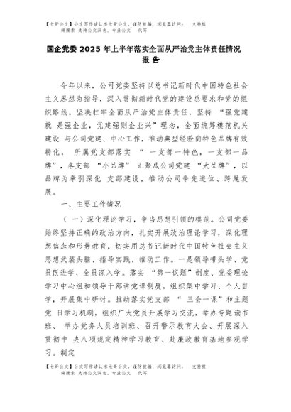 【七哥公文】2025年:国企党委2025年上半年落实全面从严治党主体责任情况报告+更多免费公文+VX:QiGeGongWen2024