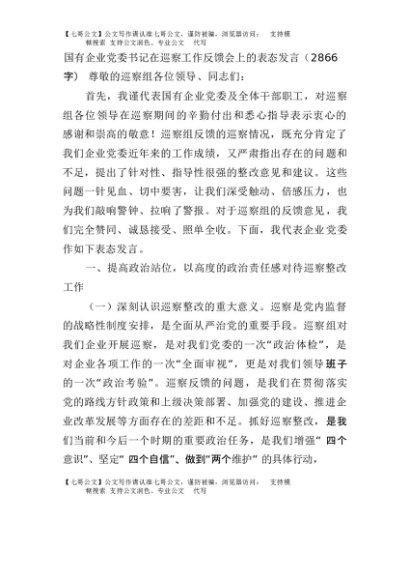 【七哥公文】2025年:国企党委书记在巡察工作反馈会上的表态发言(2866字)+更多免费公文+VX:QiGeGongWen2024