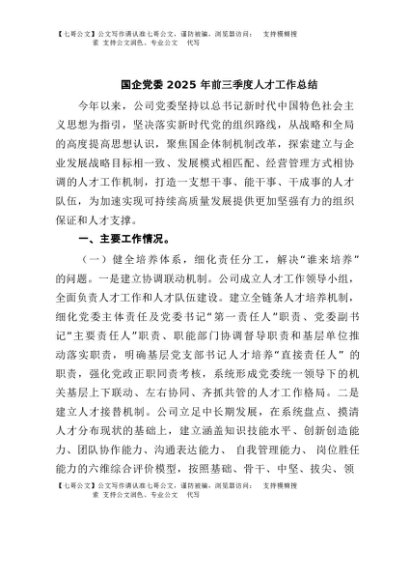 / 【七哥公文】2025年:国企党委2025年前三季度人才工作总结+更多免费公文+VX:QiGeGongWen2024