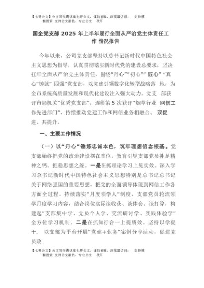 【七哥公文】2025年:国企党支部2025年上半年履行全面从严治党主体责任工作情况报告+更多免费公文+VX:QiGeGongWen2024