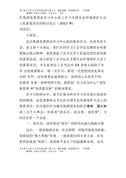 【七哥公文】2025年:国企党委理论学习中心组上学习全国生态环境保护大会上的重要讲话的研讨发言(3053字)+更多免费公文+VX:QiGeGongWen2024